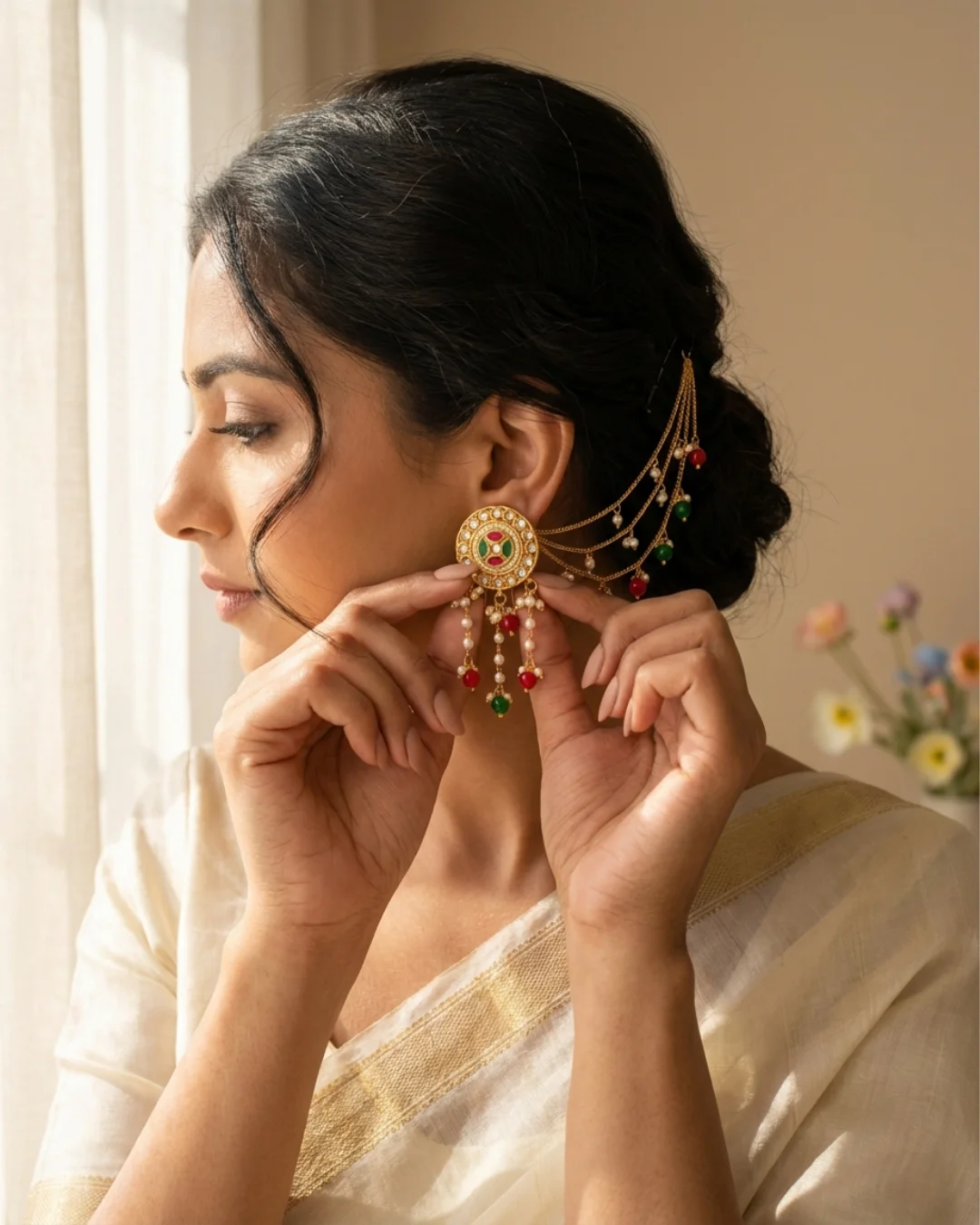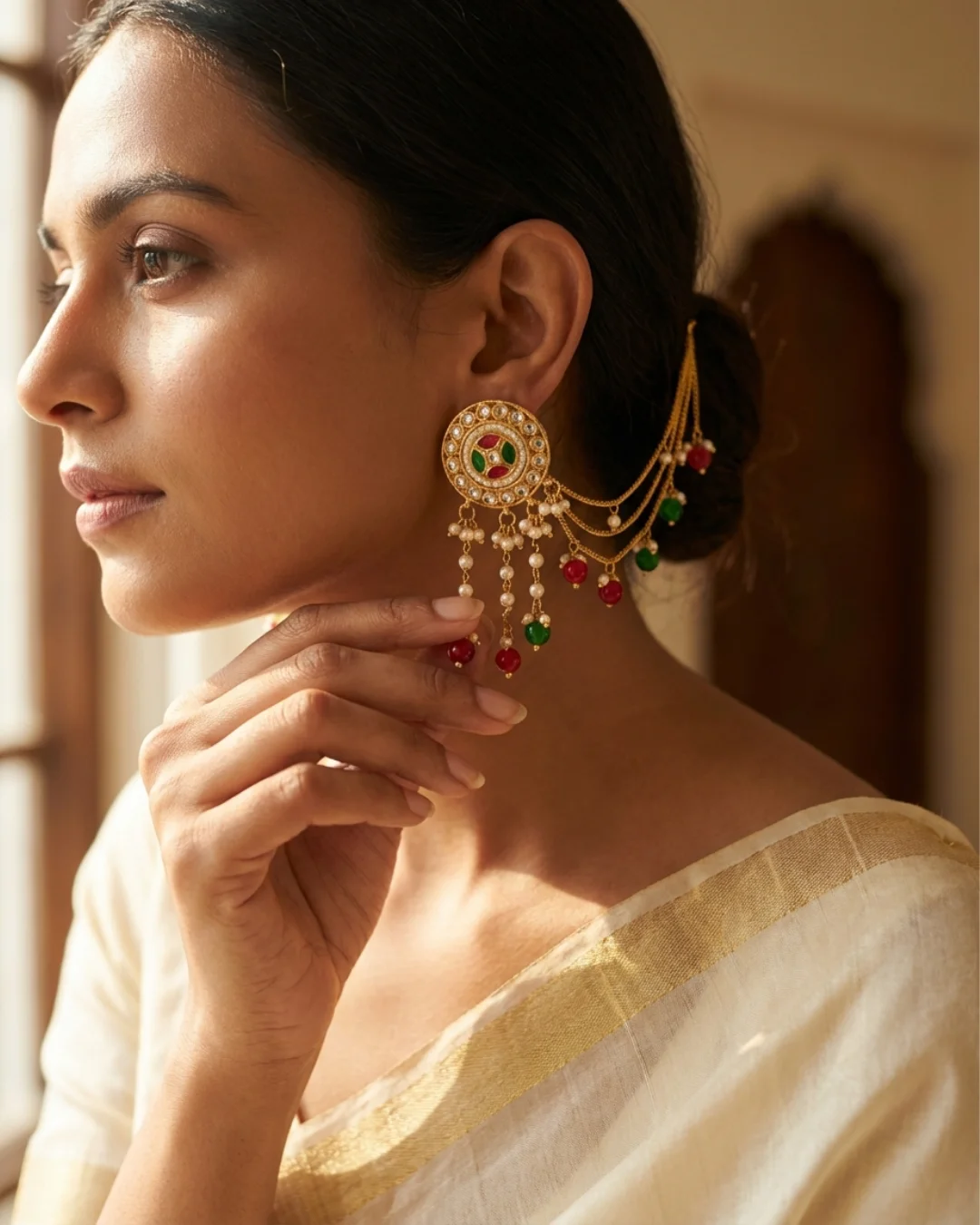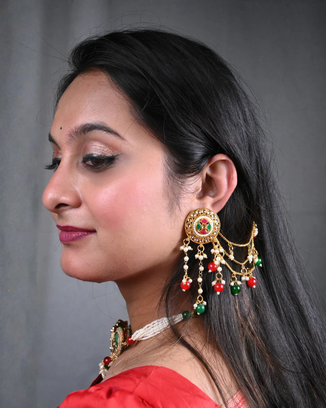 Royal Bahu Bali style ear-chain earrings with antique gold finish, multicolor accents, and pearl drops — a bold festive statement by WishBuds.