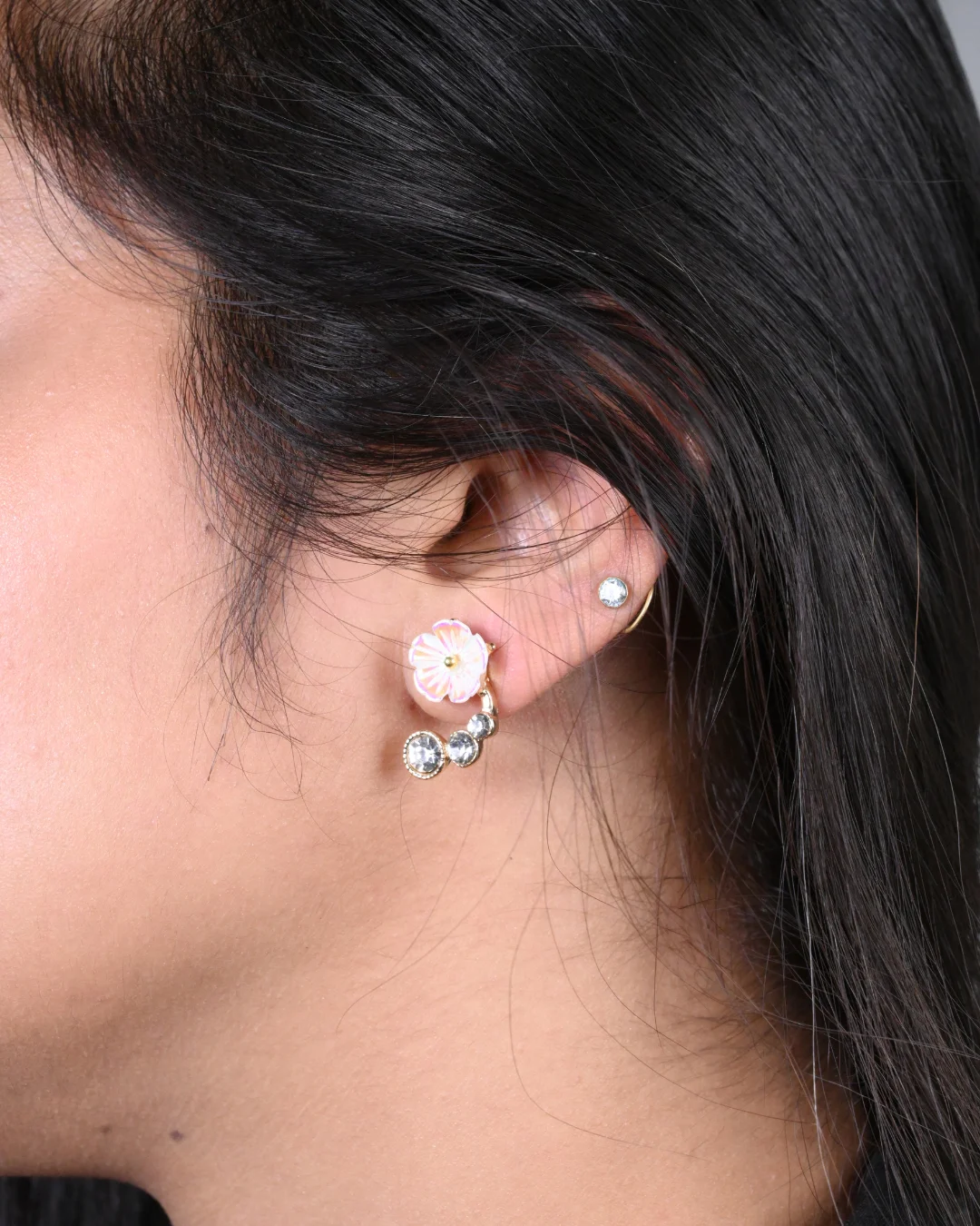 The pastel flower detail adds a charming feminine touch, while the shimmering crystals along the ear cuff bring a subtle sparkle that catches the light beautifully. Crafted with a sleek gold-tone finish, the design gracefully hugs the ear, creating a sophisticated and trendy appearance.