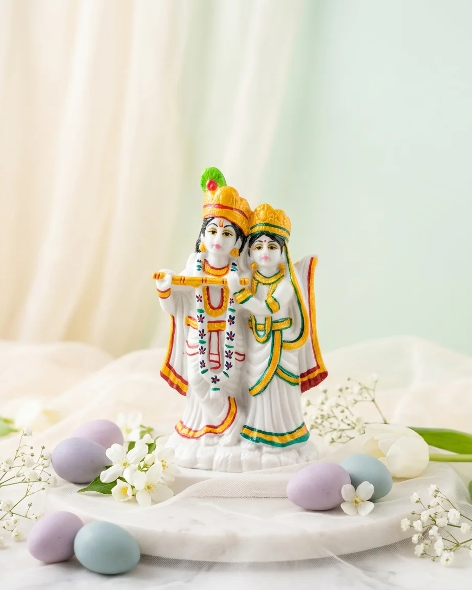 Add a touch of divine love and elegance to your space with this 6.5-inch Radha Krishna marble-finish idol. Ideal for home décor, pooja, and gifting. Available at Wishbuds.