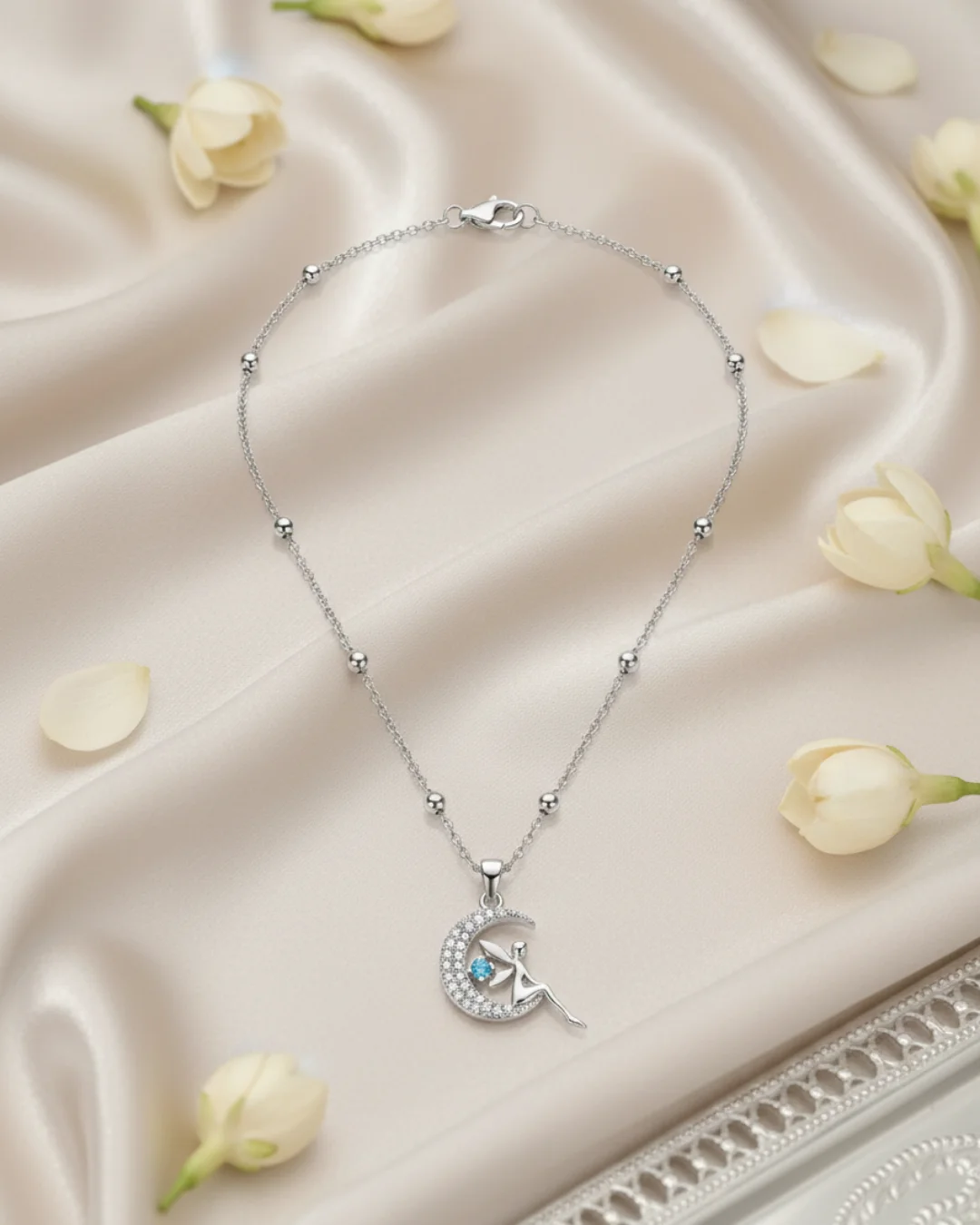 The WishBuds Moon Fairy Crystal Pendant Necklace is a graceful piece designed to capture elegance and charm. Featuring a beautifully crafted crescent moon pendant adorned with shimmering crystals, the design highlights a delicate fairy figure sitting gently on the moon, creating a dreamy and enchanting look.