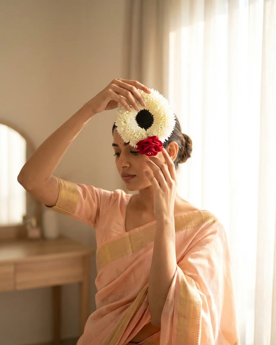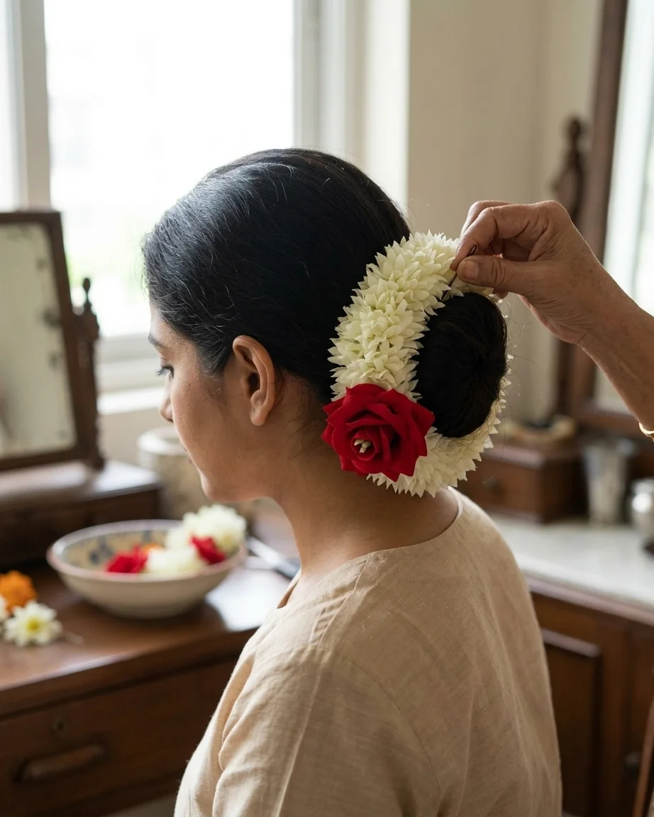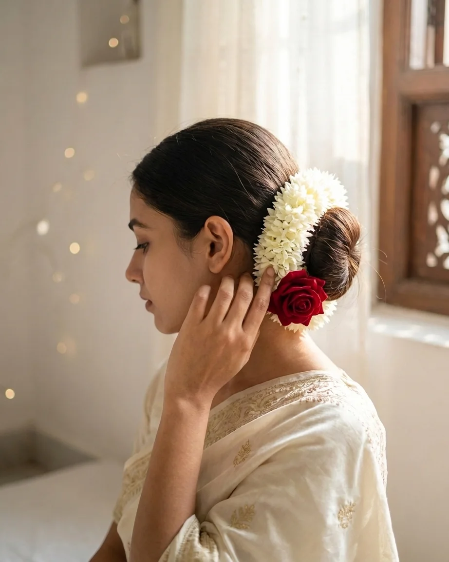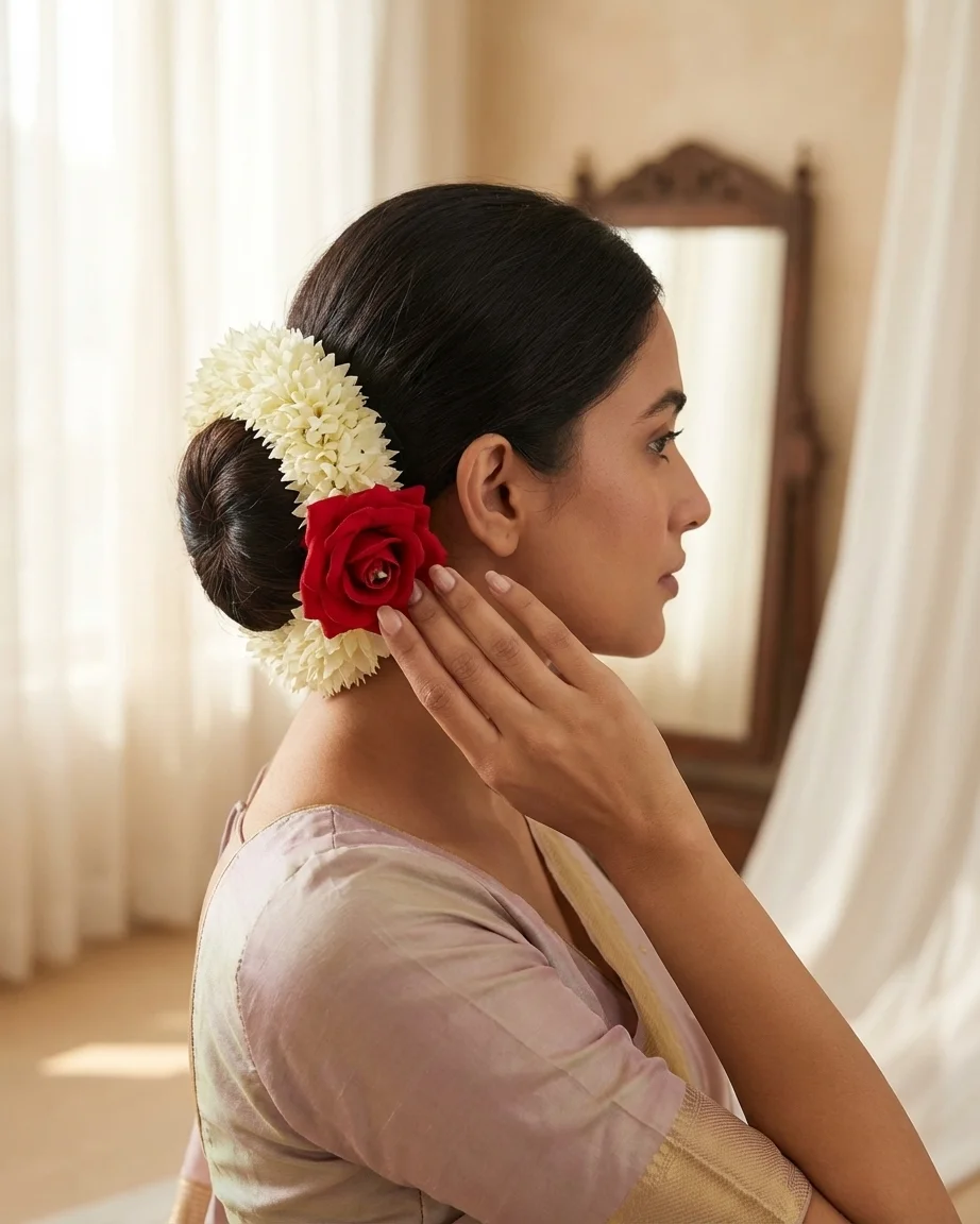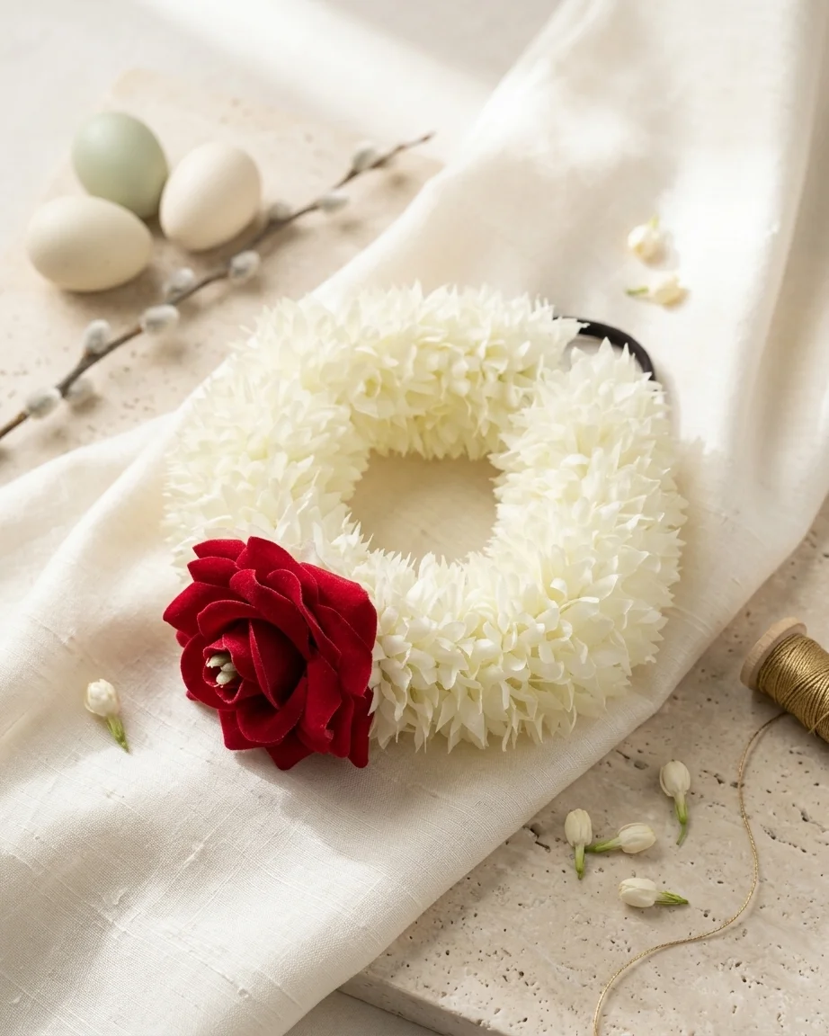 The Classic Rose Gajra blends soft jasmine layers with a single striking red rose, symbolizing beauty and tradition.