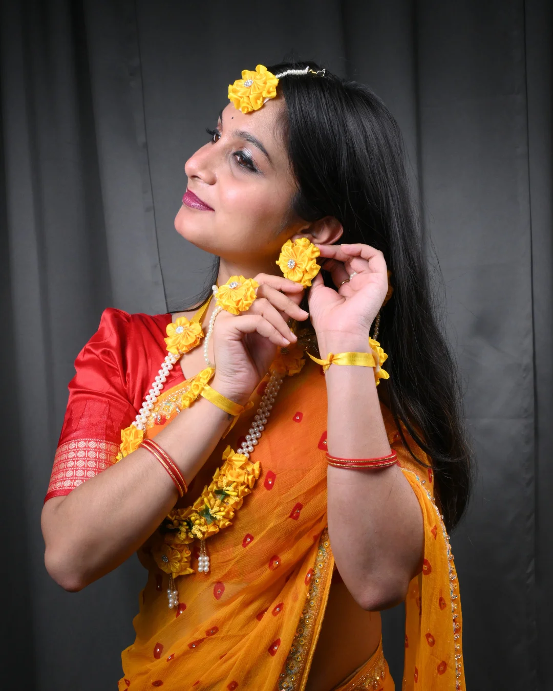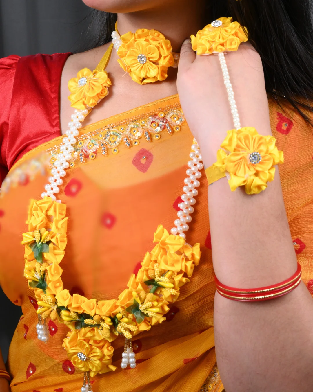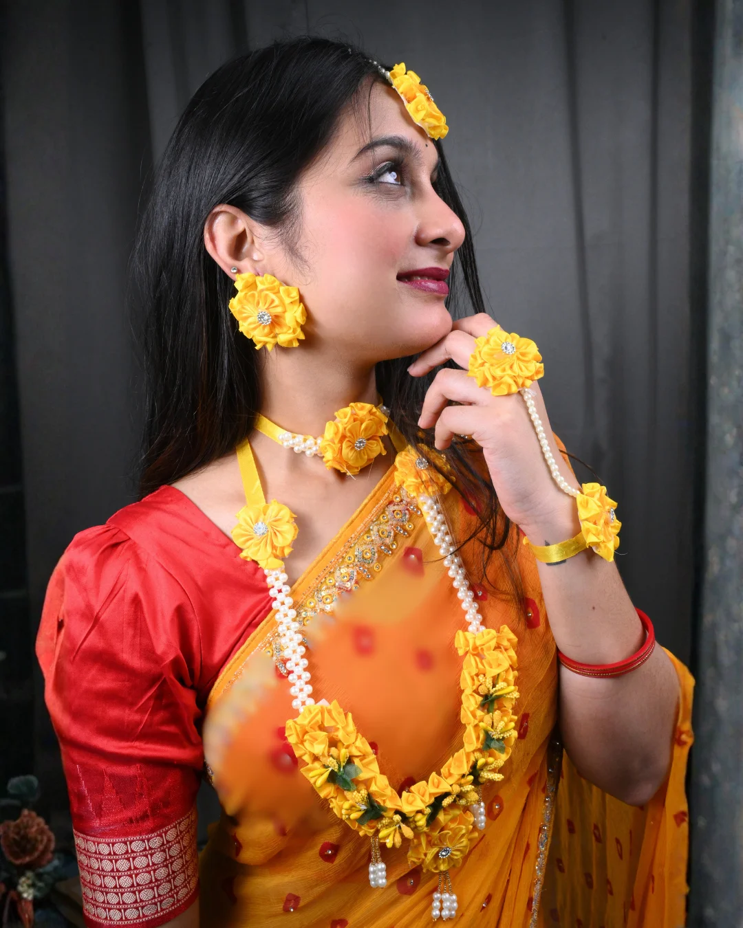Lightweight and comfortable to wear, the Sunflower Haldi Floral Jewellery Set complements haldi outfits beautifully and creates stunning pictures for your special day. It is ideal for brides, bridesmaids, and anyone who wants to celebrate the moment with colorful elegance.