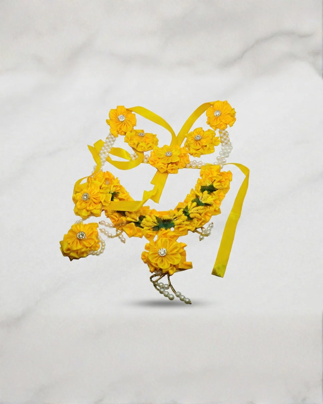 Add a joyful and radiant touch to your pre-wedding celebrations with the WishBuds Sunflower Haldi Floral Jewellery Set. Inspired by bright sunflower tones, this beautifully handcrafted set features delicate yellow fabric flowers decorated with pearl details and sparkling stone accents.